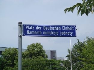 Foto oben: Das neue Straßenschild „Platz der Deutschen Einheit“.